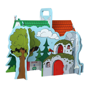 Husene er laget i robust tre og har dører som kan åpnes. Takket være den medfølgende lekeplaten kan barna leke både inne i husene og rundt omkring. De fargerike illustrasjonene på både innsiden og utsiden gjør at det alltid er noe nytt å oppdage.