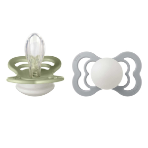 BIBS Smokk Supreme Night Silikon 2-pak 6-18 mnd Sage/Cloud er stilrene smokker som lyser i mørket - trygghet hele døgnet. Den lette skjermen har store ventilasjonshull som lar barnets hud puste og hjelper til med å holde området rundt munnen tørt og behagelig. Glow-funksjonen gjør at smokkene lyser svakt i mørket, slik at de er enkle å finne om natten.