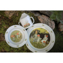 Servise med Elsa Beskow-motiv bestående av tre deler: tutekopp med sølesikkert lokk hvor sølesikringen er lett å holde ren, praktisk sugekoppplate med skålede sider for å gjøre det lettere for små barn å spise, og en flat tallerken med anti-skli ring.