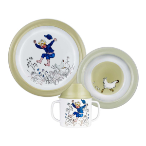 Praktisk og gjennomtenkt barneservis i tre deler fra Rätt Start. Settet inneholder en tutekopp med to gripevennlige håndtak, en dyp tallerken og en flat tallerken.
