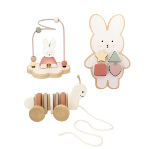 Et bedårende gavesett med kanintema som byr på både glede og utviklende lek. Settet inneholder tre treleker: en draleke, et formpuslespill og en kulebane – perfekt for små barn som elsker å utforske verden.