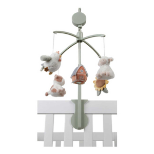 Musikkuroen er utsmykket med fem nydelige bondegårdsfigurer som beveger seg harmonisk til musikken. Bevegelsene gjør det spennende for barnet å følge med, og støtter utviklingen av tidlig hånd–øyekoordinasjon. Takket være den praktiske festeløsningen kan musikmobilen monteres på de fleste sprinkelsenger og stellebord. Den blir raskt en fast del av barnets leggrutine - helt fra nyfødtperioden.