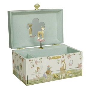 Når spilledåsen trekkes opp på baksiden og lokket løftes, kommer et lite rådyr frem og begynner å snurre foran speilet mens en myk melodi spilles. Den bevegelige figuren skaper et magisk øyeblikk som barnet vil sette pris på hver gang skrinet åpnes. Skrinet har et romslig hovedrom for smykker og små skatter, samt en ekstra liten skuff foran for mindre tilbehør. På innsiden av lokket finnes også et speil, perfekt når barnet vil prøve smykker under leken.