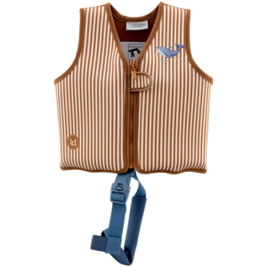 Svømmevesten er designet for å gi oppdrift samtidig som barnet kan bevege seg fritt og komfortabelt i vannet. Den har en justerbar stropp med spenne mellom bena som sørger for at vesten sitter godt på plass under hele badestunden.