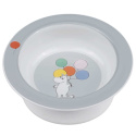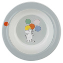 Holdbar skål fra Rätt Start med Mummitrollet-motivet Festligheter og en praktisk silikonring på undersiden. Silikonringen sørger for at skålen står stabilt på bordet.