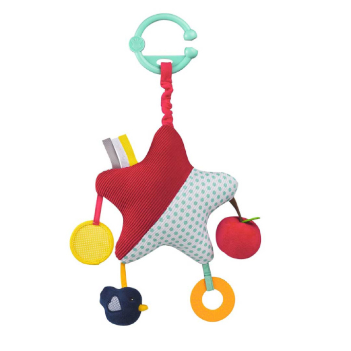 Morsomt aktivitetsleketøy i form av en stjerne fra Sophie La Girafe. Stjernen har mange morsomme ting å oppdage som et speil på magen, bitering for kløende tannkjøtt og mange morsomme leker og rangler på armene. Stjernen henges lett i barnevognen med det medfølgende feste.