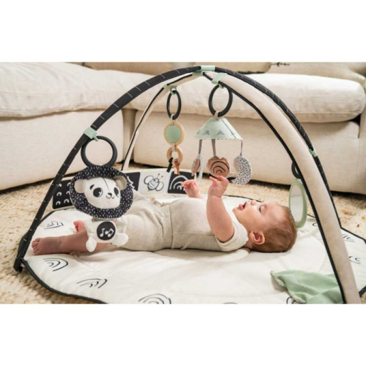 En fantastisk søt babygym fra Tiny Love med mange morsomme og lærerike detaljer for barnet ditt! På trerammen over babygymmet henger en uro, en liten løvebamse med innebygd musikk, og tre gripe-ringer i naturlig tre med rangle. Rundt babygymmet er det et speil, et sparkebrett med rangle, samt en myk bok som kan festes og tas av babygymmet. Speilet og den myke boken er for eksempel perfekt for å forlenge magetiden og oppmuntre til grovmotorikk.